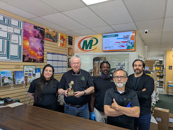 CORAL SPRINGS, Fla. – Dave and Jane Johnson are the owners of Minuteman Press in Coral Springs, FL since May of 2009. RVP Larry Trimble presented Dave and team with their Golden Minuteman Award celebrating 15 years in business. Larry shares, “Dave and Jane continue to grow and be successful by sticking to what works – providing high quality products and outstanding customer service.”